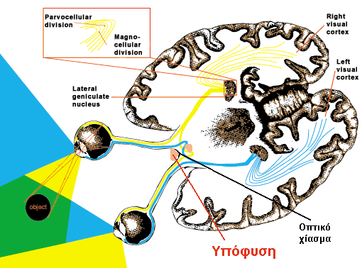 Επειδή η υπόφυση κατασκηνώνει σε μια περιοχή του κρανίου που λέγεται τουρκικό εφίππιο (σαμάρι), όταν έχουμε αδένωμα υπόφυσης, τότε ασκούνται πιέσεις σε παρακείμενους ιστούς. Ένα σημαντικό ανατομικό στοιχείο, που βρίσκεται πάνω από την υπόφυση και πιέζεται από την διόγκωσή της, είναι το οπτικό χίασμα. Στο οπτικό χίασμα, χιάζονται οι οπτικές ίνες που έρχονται από τα δυο μάτια στην διαδρομή τους προς τον εγκέφαλο. Η άσκηση πίεσης πάνω σε αυτές τις ίνες , από την διογκωμένη υπόφυση, προκαλεί βλάβες στην όραση και κυρίως στα οπτικά πεδία. Γι΄αυτό ο πάσχων από αυξημένη προλακτίνη, πρέπει να ελέγχει τα μάτια του και ιδίως με την εξέταση των οπτικών πεδίων, την Αυτόματη Έγχρωμη Ηλεκτρονική Περιμετρία, καθώς και οι εμφανίζοντες μη αιτιολογούμενη έκπτωση των οπτικών πεδίων πρέπει να ελέγχουν τα επίπεδα προλακτίνης.